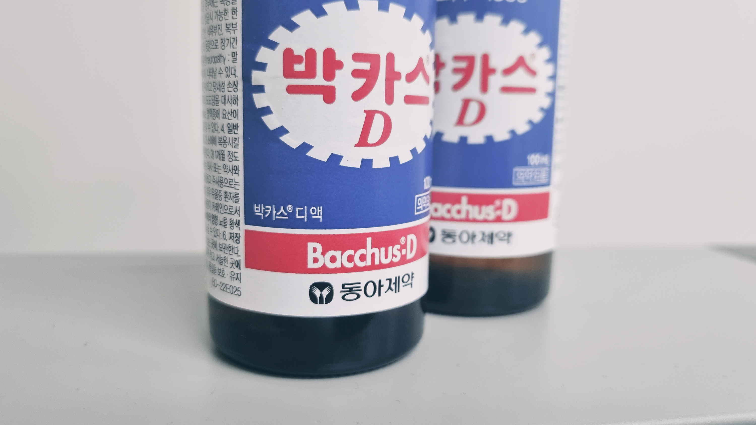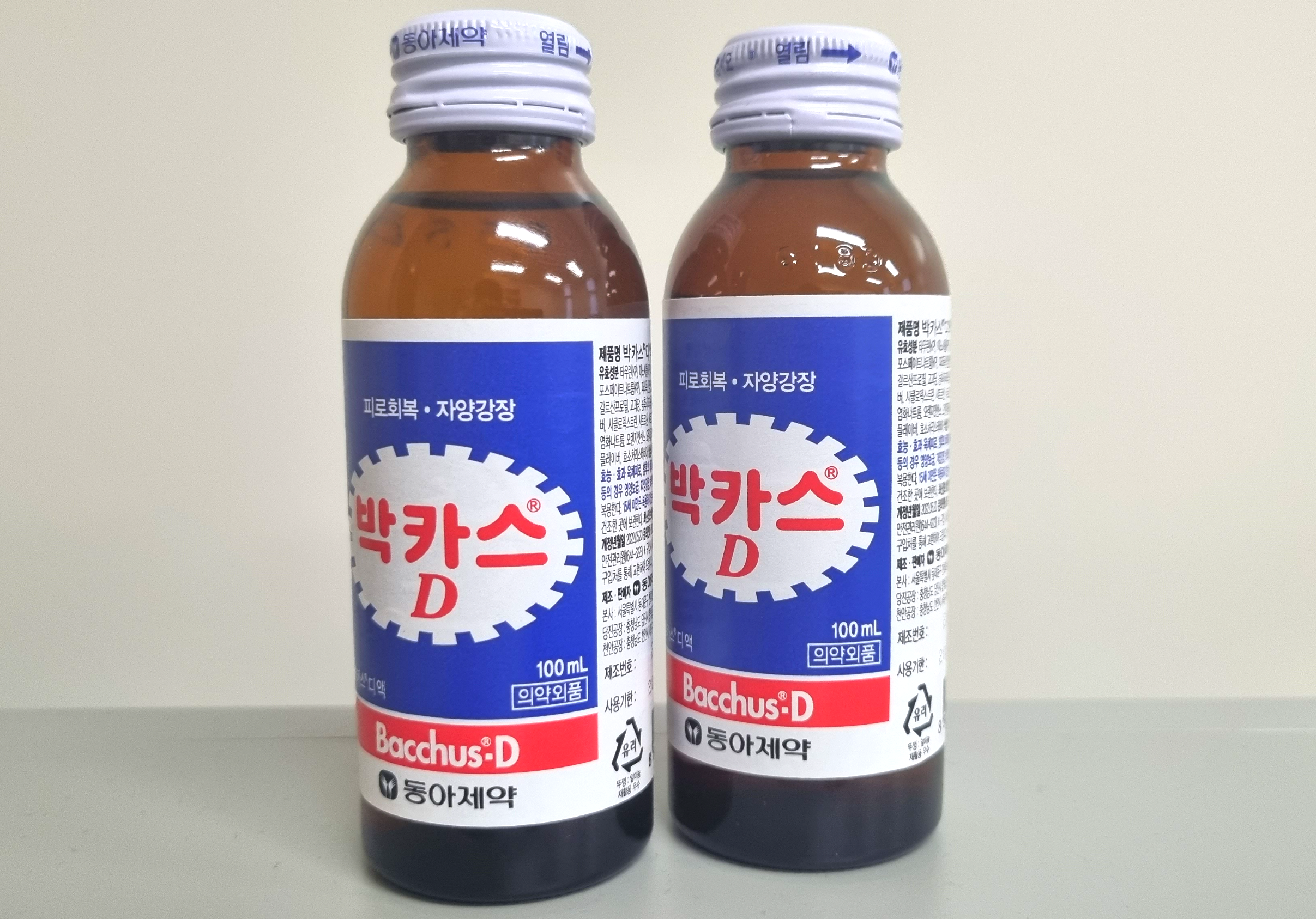 얼핏 보기에 병 색깔은 약 90% 이상 똑같습니다. 하지만 둘을 나란히 두고 보면 약간의 차이점을 알 수 있는데요. 파란색 배경에 흰색 톱니바퀴 문양, 그리고 빨간색의 박카스 라는 글자는 D와 F의 공통점입니다.